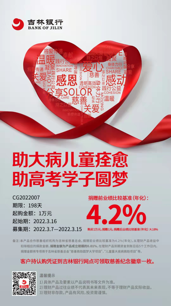 3月16日,吉林银行成功发行首款慈善理财产品,募集金额11.97亿元。该期产品合作机构为吉林省慈善总会,捐赠金额为产品成立金额的0.01%。捐赠资金专项用于“儿童重大疾病救助项目”和“慈善救助圆梦大学项目”。