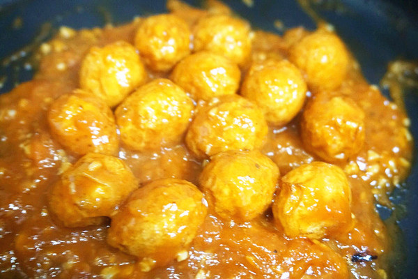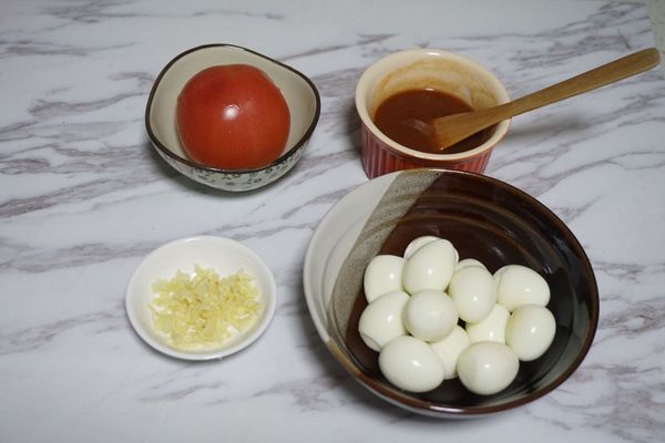 7、放入虎皮蛋,再加入番茄酱,加入适量水,盖盖子焖5分钟,直到收汁即可。