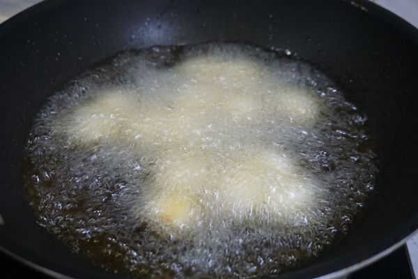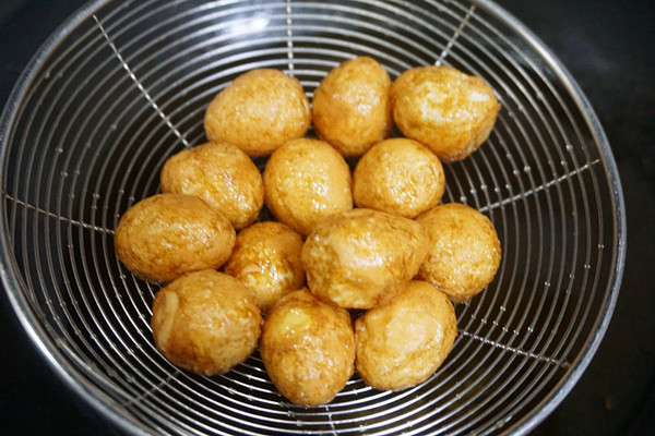 4、油烧到7成热,倒入鹌鹑蛋,快速炸到金黄,表面金黄即可,炸的时间不要太长,不然口感老了就不好。