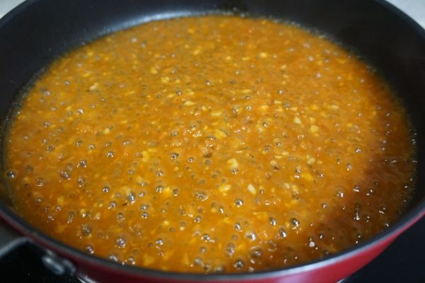 6、加入番茄碎和盐,炒出番茄汁。