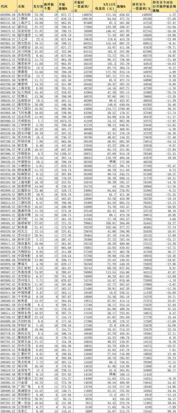 当然也有给小伙伴们好回报的新股,例如金冠电气,在10个涨停板后打开的该个股随后一路上涨,9月13日的收盘价较打开涨停板前一日的收盘价又再次上涨了96.12%,同样名家汇也有90.34%的额外涨幅。