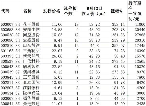 通过数据显示,截至9月13日,今年来共有114只新股上市,目前仍在涨停板中的有16只,其中沪市7只,深市9只,这16只新股中上市时间最早的为8月26日上市的花王股份、同益股份和山东赫达,这三只基金目前均已经达到12个涨停板,最新收盘价都较发行价上涨350%以上。