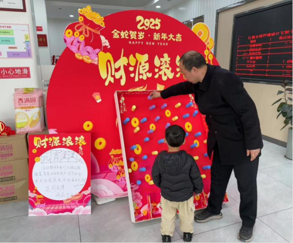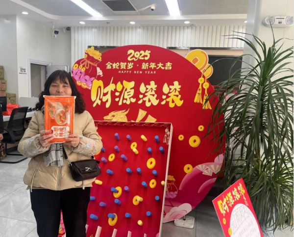 大桥支行“元宵滚滚·财源滚滚”游戏区人气高涨。客户需将象征财富的“元宵”滚入“好运洞”,成功者即可赢取对应奖品。参与者全神贯注瞄准目标,现场喝彩声此起彼伏。“游戏简单但寓意好,希望新的一年财源广进!”一位女士捧着奖品笑称。