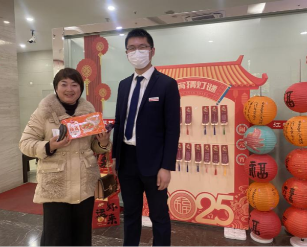 在营业部“花灯闹岁 喜乐元宵”活动现场,一盏盏红灯笼下悬挂着精心设计的灯谜,巧妙地将金融知识与传统文化结合。例如,“理财稳如泰山(打一金融术语)”等谜题吸引众多客户驻足竞猜。猜中谜底的参与者不仅收获了欢声笑语,还获得了象征团圆的汤圆礼盒。“没想到存钱还能猜灯谜领奖品,既有趣又长知识!”一位客户欣喜地表示。